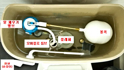 특히 물 채우기 밸브(충전밸브), 오버플로 튜브, 레버, 볼콕, 플래퍼(고무) 등 동작 상태를 유심히 잘 봐야 합니다.